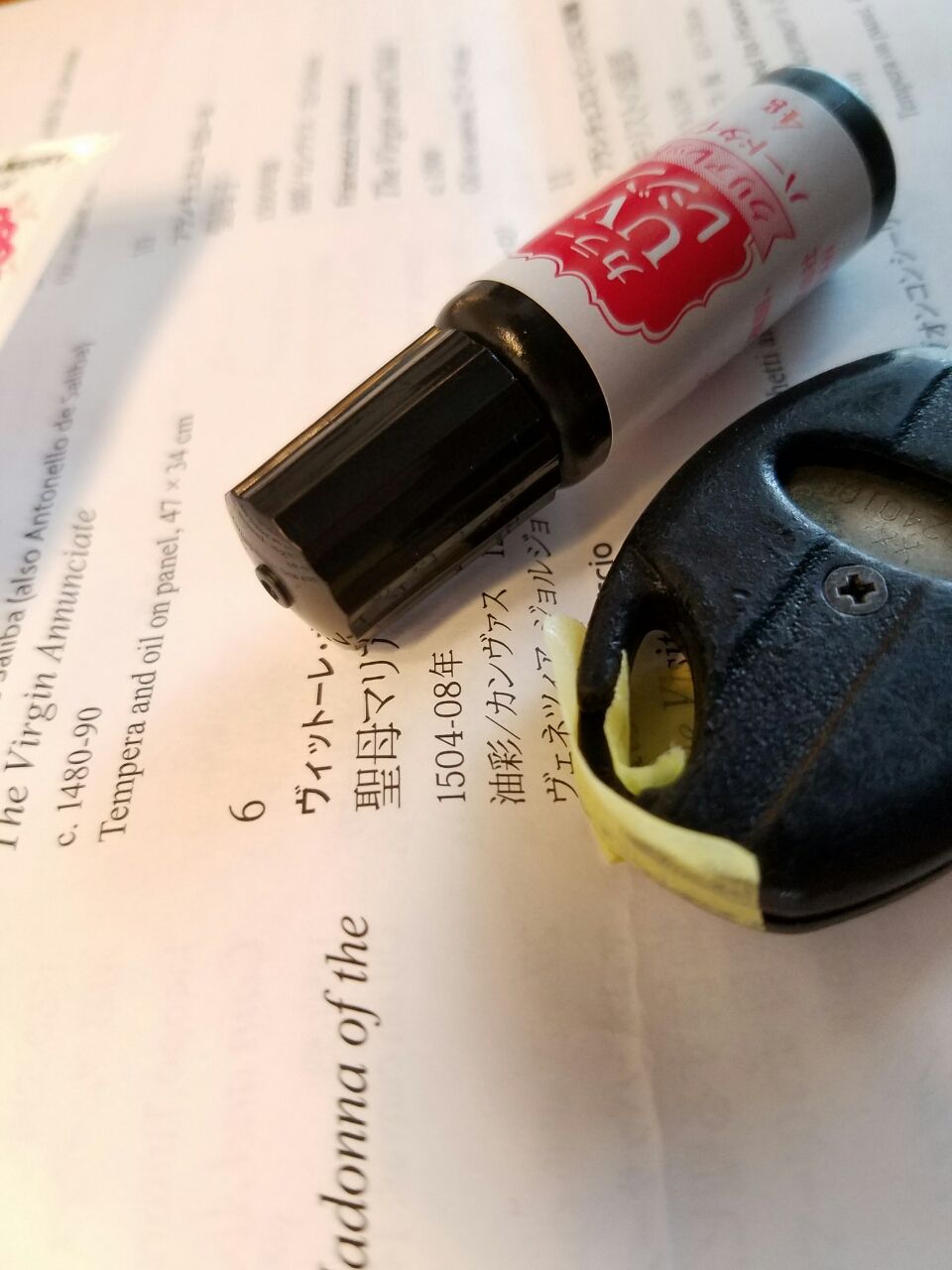 プラスチックが欠けてしまった部分を養生テープ(これもセリア)で囲い、黒色のレジンも買っていたが、ワンポイントで赤色のレジンを流し込んだ。